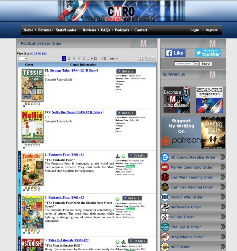 For what must be over a decade now, the site’s owner has been going through Marvel comics, and putting them in different story orders, according to different universes and contexts (complete, essential, ultimate, etc), tagged with metadata, characters, and story arcs. Each week, he adds a bit more to the lists and updates the forums with what’s new, often with some discussion about what changes could be made.